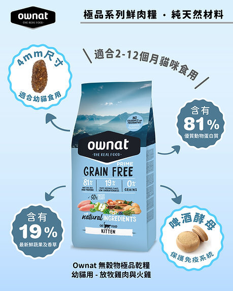 Ownat 無穀物乾糧極品系列是一種營養替代品,它模仿生活在大自然中完全自由的狗或貓,它們的身體已經準備好自發地遵循飲食習性。狗和貓的消化系統不能消化未經煮熟的穀物,雖然它們可以消化煮熟的穀物,但這也可能是食物致敏和不耐受症狀的來源,這就是我們從無穀物配方中完全去除穀物的原因。高比例的動物來源成份以及新鮮肉類可提供更高水平的生物價值蛋白質,這些蛋白質提供必需氨基酸,這些氨基酸對於身體的正常發育和功能至關重要。高水平的動物來源成份使我們能夠創建更低碳水化合物的食譜。我們使用例如豆類和塊莖來代替穀物中的碳水化合物來源。